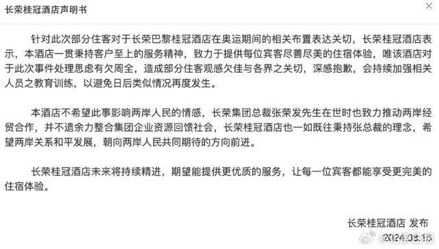 近日,一名网友爆料称,巴黎一台资酒店——长荣桂冠酒店大厅内悬挂奥运会参赛国家和地区的小型旗帜,却没有挂中国国旗,据称是酒店总经理要求剪掉,这名博主提供国旗要求挂上却遭到拒绝。长荣桂冠酒店8月15日在上海长荣桂冠酒店微信公众号发布声明,对此事作出回应。