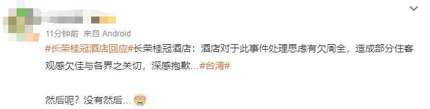 还有网友说,“长荣桂冠酒店:酒店对于此事件处理思虑有欠周全,造成部分住客观感欠佳与各界之关切,深感抱歉……然后呢?没有然后……”
