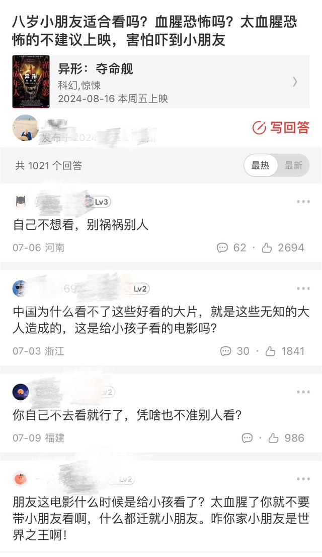 极目新闻记者注意到,在网络售票平台“猫眼”的《异形:夺命舰》售票页面,一位观众在问答区提问:“八岁的孩子适合看吗?太恐怖的不建议上映,害怕吓到小朋友。”截至目前,这个问题已经得到了1022个热心回答,其中多数答案都是在质疑这位家长。