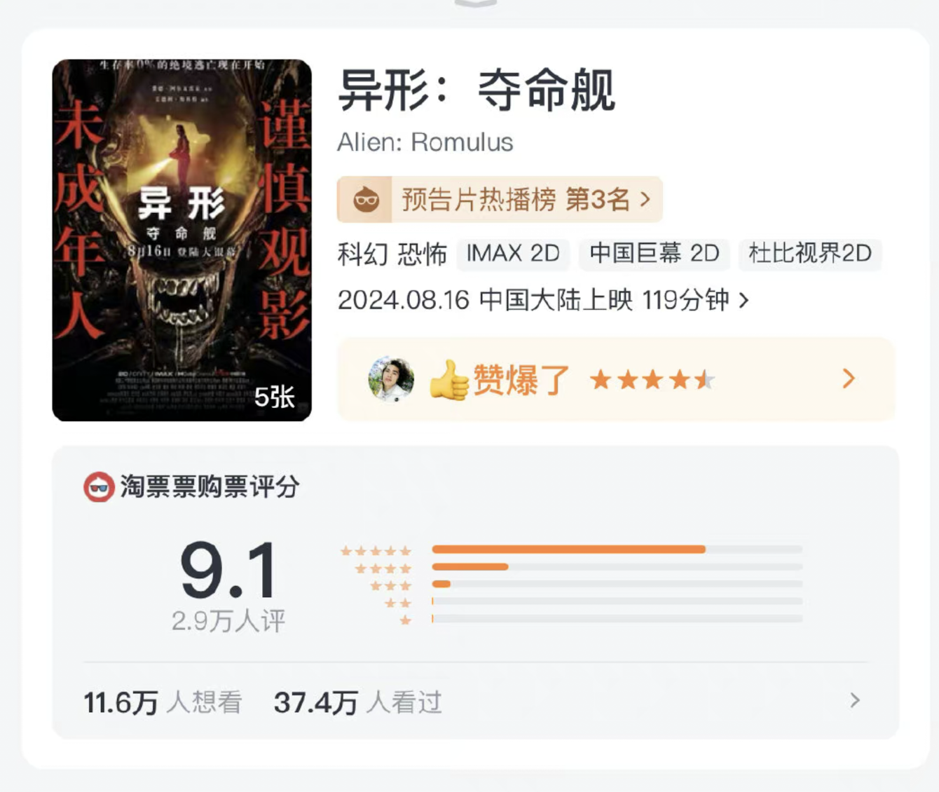 比如,在购票软件上增加弹窗提示,明确电影的适合观影人群,规避观影风险。再比如,类似《异形:夺命舰》这样可能会吓到小朋友的片子,入场检票时,工作人员也要做好提醒工作,告知家长要注意孩子的情绪。