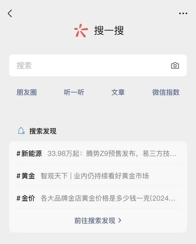 此外,微信近期还新增了“搜索发现”功能。在微信中点击“发现”-“搜一搜”,在搜索框下方就可以看到“搜索发现”功能,以话题的形式展示最相关、最热门的内容,点击即可跳转到公众号或者视频号查看相关内容。