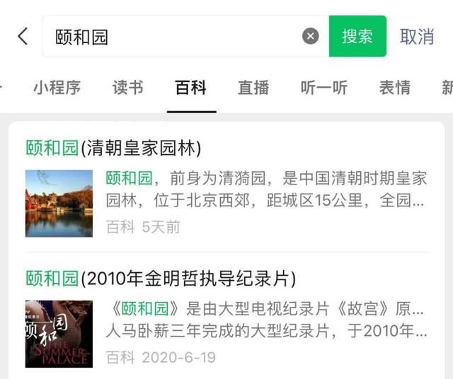 在微信搜一搜中搜索“颐和园”时,搜索结果中会出现“颐和园”的百科内容。在搜索结果的分类频道中,微信也新加入了“百科”频道。该频道中,呈现的是与搜索关键词相关的所有百科内容。