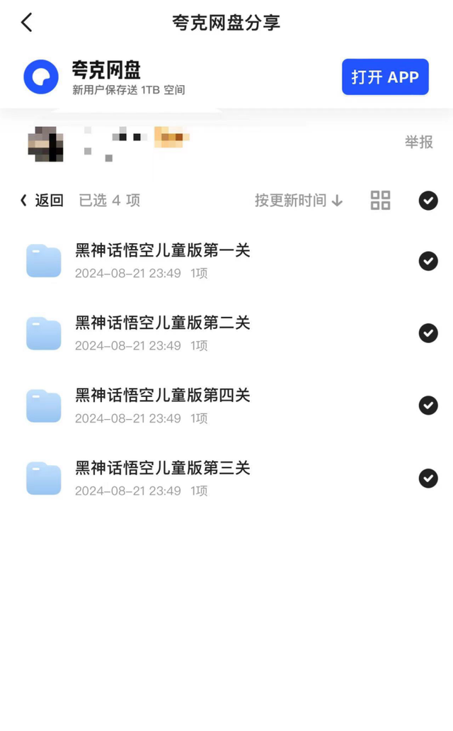 以闲鱼平台为例,记者看到,一个售价1元的《黑神话:悟空》商品链接介绍上写道:黑神话悟空离线完整版并且包括“学习版”和“修改器”,解压安装即可玩。但当记者购买进入商家发送的夸克网盘链接时,发现竟然是“黑神话悟空儿童版。”