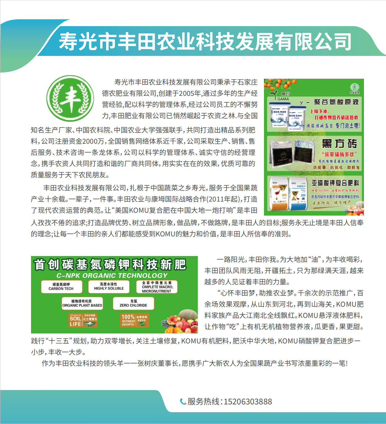 丰田农业科技发展有限公司,扎根于中国蔬菜之乡寿光,服务于全国果蔬产业十余载。一辈子,一件事。丰田农业与康坶国际战略合作打造了现代农资运营的典范。让“美国KOMU复合肥在中国大地一炮打响”是丰田人孜孜不倦的追求;打造品牌优势、树立品牌形象,做品牌,不做路牌,是丰田人的目标;服务永无止境是丰田人信奉的理念;让每一个丰田的亲人们都能感受到KOMU的魅力和价值,是丰田人所信奉的准则。