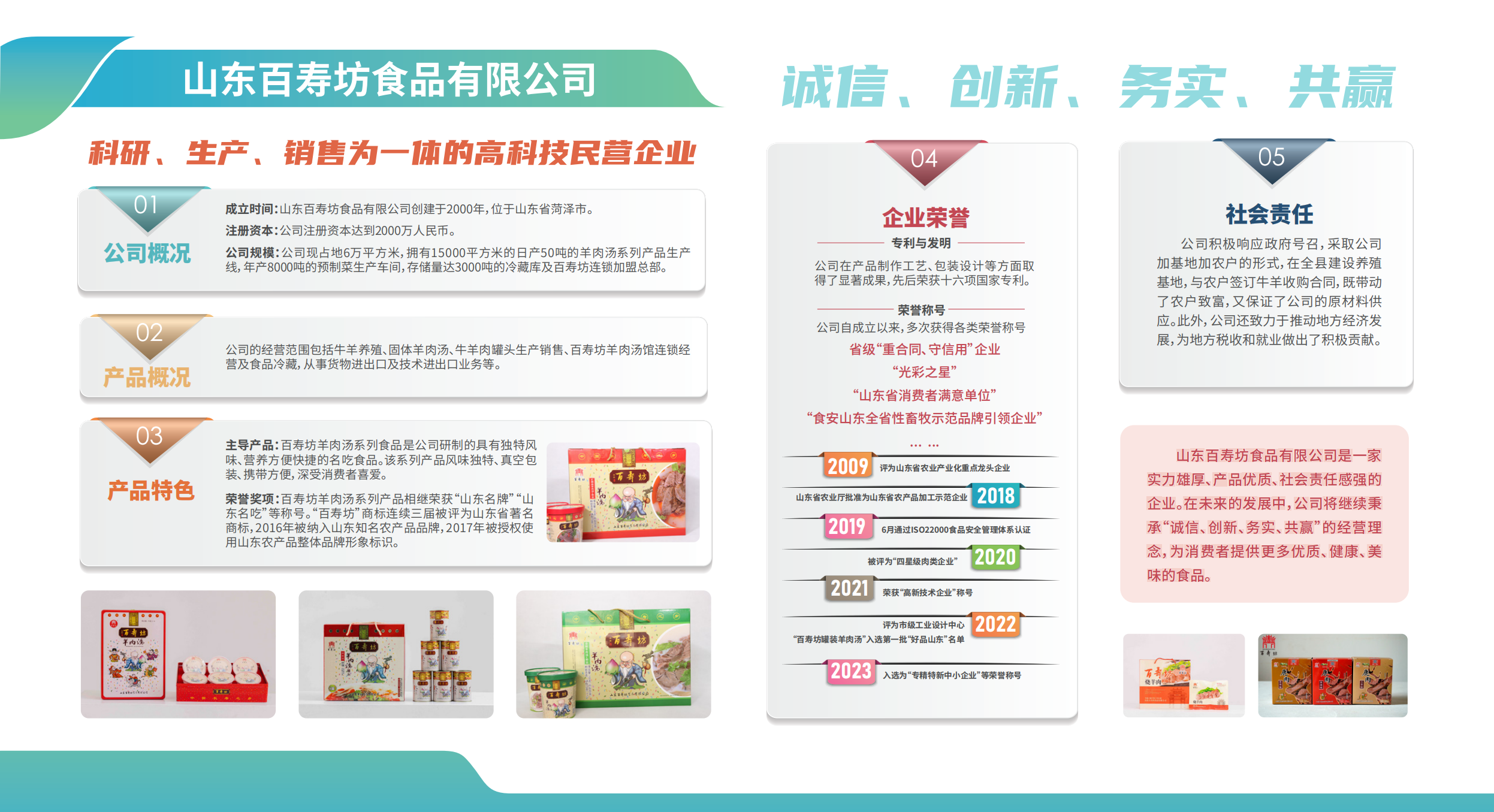 荣誉奖项:百寿坊羊肉汤系列产品相继荣获“山东名牌”“山东名吃”等称号。“百寿坊”商标连续三届被评为山东省著名商标,2016年被纳入山东知名农产品品牌,2017年被授权使用山东农产品整体品牌形象标识。