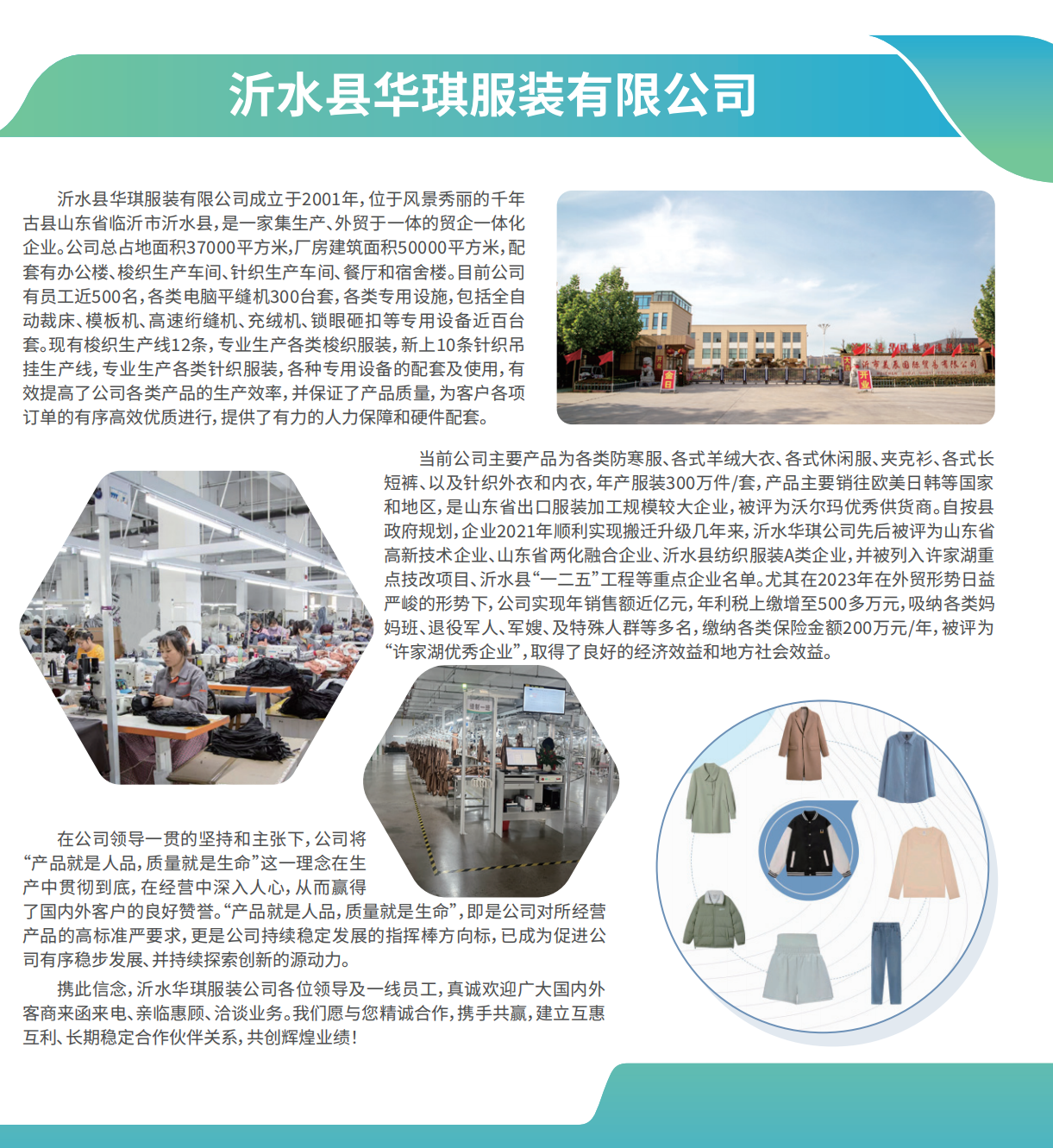 当前公司主要产品为各类防寒服、各式羊绒大衣、各式休闲服、夹克衫、各式长短裤、以及针织外衣和内衣,年产服装300万件/套,产品主要销往欧美日韩等国家和地区,是山东省出口服装加工规模较大企业,被评为沃尔玛优秀供货商。自按县政府规划,企业2021年顺利实现搬迁升级。几年来,沂水华琪公司先后被评为山东省高新技术企业、山东省两化融合企业、沂水县纺织服装A类企业,并被列入许家湖重点技改项目、沂水县“一二五”工程等重点企业名单。尤其在2023年在外贸形势日益严峻的形势下,公司实现年销售额近亿元,年利税上缴增至500多万元,缴纳各类保险金额200万元/年,被评为“许家湖优秀企业”,取得了良好的经济效益和地方社会效益。