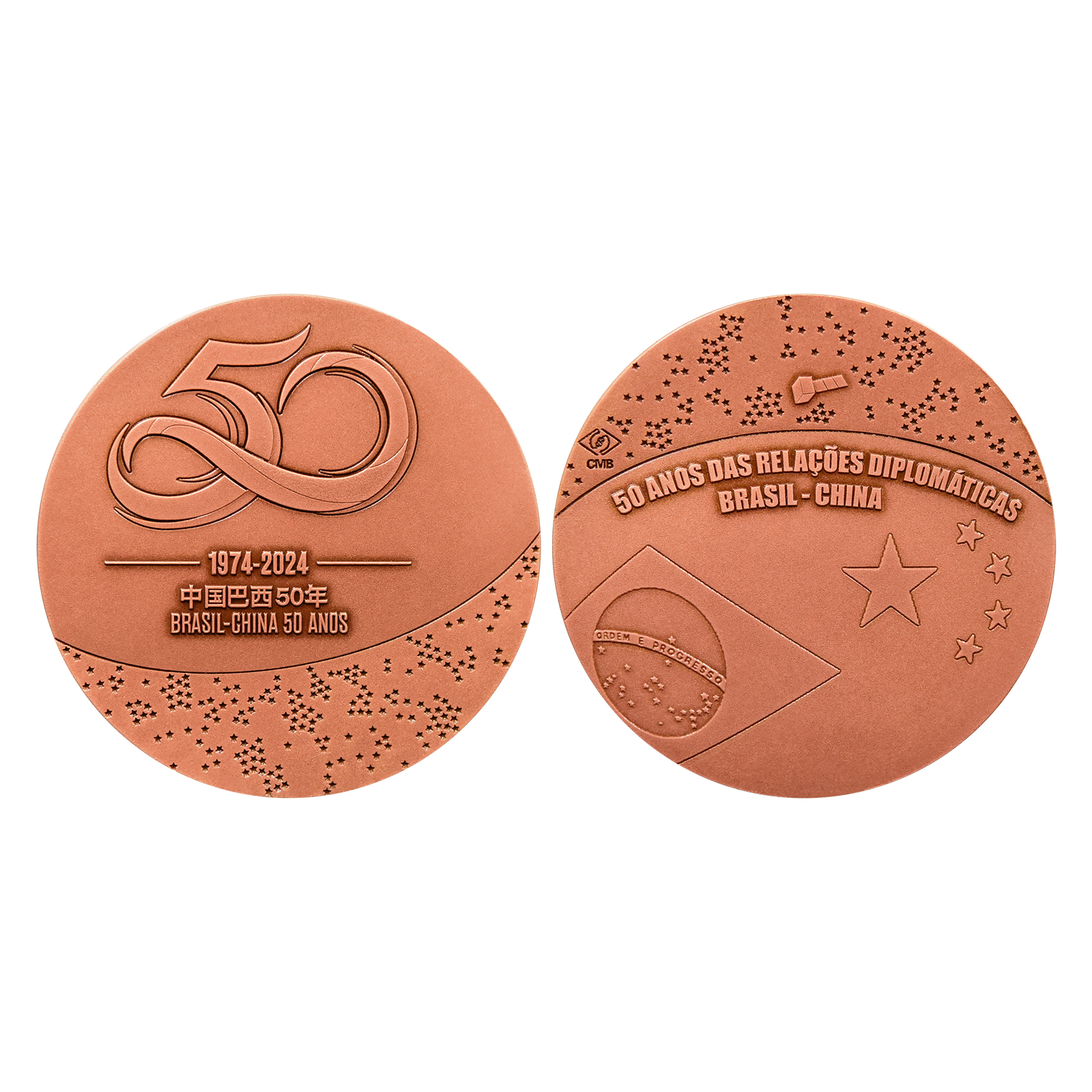 这枚纪念章由青铜铸造,由巴西造币艺术家费尔南达·科斯塔和米莉·布里托设计。纪念章整体构图采用了“地球与星空”的设计理念。正面在象征地球的区域内使用了中巴建交50周年标识作为主图案,标识下用中文和葡萄牙文双语标注了“中国巴西50年”的文字信息。反面图案更加鲜明地展现了中巴同处地球、仰望星空的构图,在地球区域上绘有中巴两国国旗,并以葡萄牙语标注了“中巴建交50周年”字样。天空部分除满天星辰外,正中间还有一颗卫星图样,象征着中巴航天合作重点项目——地球资源勘测卫星。