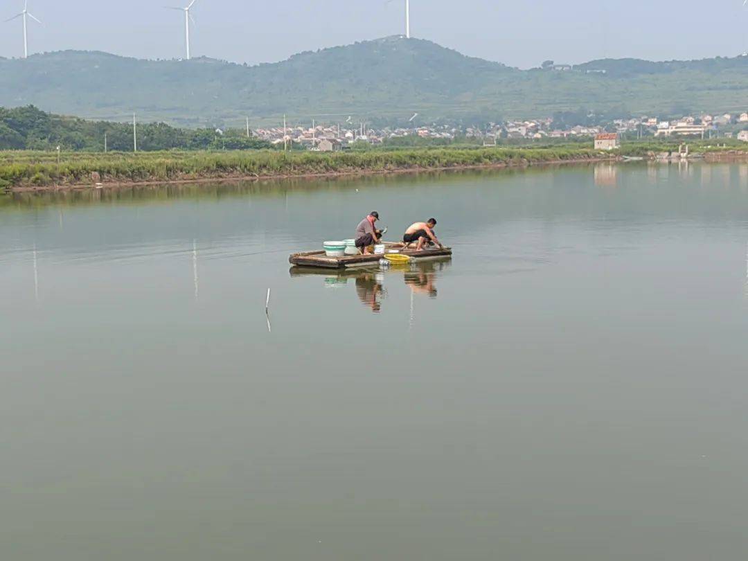 小木筏上,一人收网,一人绑螃蟹
