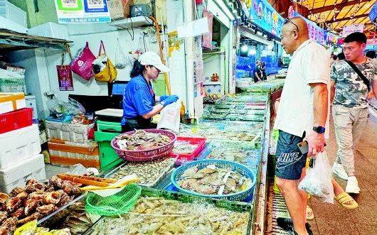 临近中午的团岛农贸市场,人流如织。“看看梭子蟹,包肥!”海鲜摊位的摊主们叫卖着。