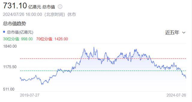 财报一经发出,周大福股价一度下跌。截至7月26日收盘,周大福股价为7.32港元/股,市值为731.1亿港元,创2020年9月以来的新低。