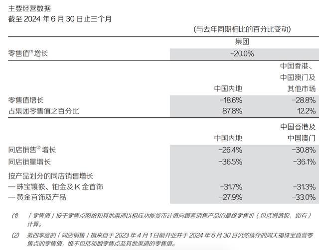 2024年4月至6月期间,周大福在中国内地市场零售值同比下跌18.6%,中国香港、澳门及其他市场则同比下滑28.8%。