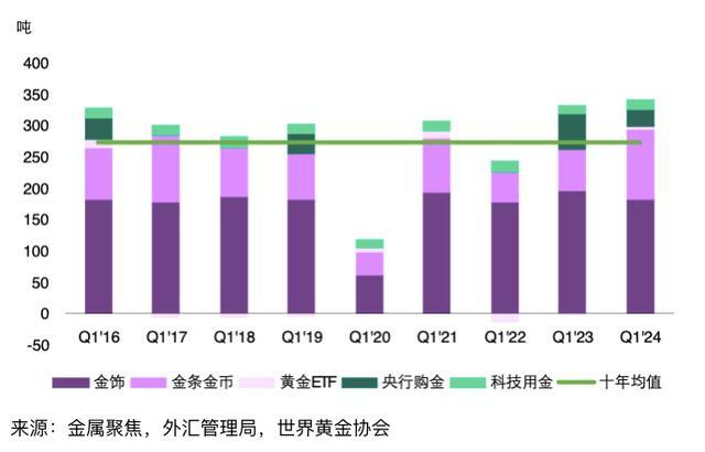 世界黄金协会于4月发布的《全球黄金需求趋势报告》显示,2024年一季度,中国金饰消费同比下滑6%,至184吨。今年1、2月份金饰消费需求非常旺盛,但3月持续飙升的金价抑制了消费。