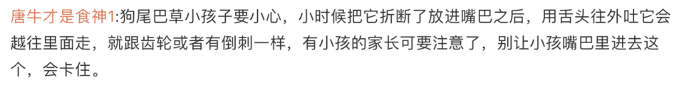 看过新闻,很多网友表示,狗尾巴草容易产生倒刺,在孩子嘴巴里会被卡住。