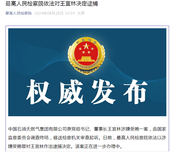 中国石油原党组书记、董事长王宜林被决定逮捕 大众报业·齐鲁壹点 2024-08-28 4270 中国石油天然气集团有限公司原党组书记、董事长王宜林涉嫌受贿一案,由国家监察委员会调查终结,移送检察机关审查起诉。日前,最高人民检察院依法以涉嫌受贿罪对王宜林作出逮捕决定。该案正在进一步办理中。 责任编辑:刘相华