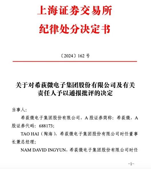 鉴于上述违规事实和情节,上交所作出如下纪律处分决定:对希荻微电子集团股份有限公司及时任董事长兼总经理TAO HAI(陶海)、时任总经理NAM DAVID INGYUN、时任财务总监兼董事会秘书唐娅予以通报批评。