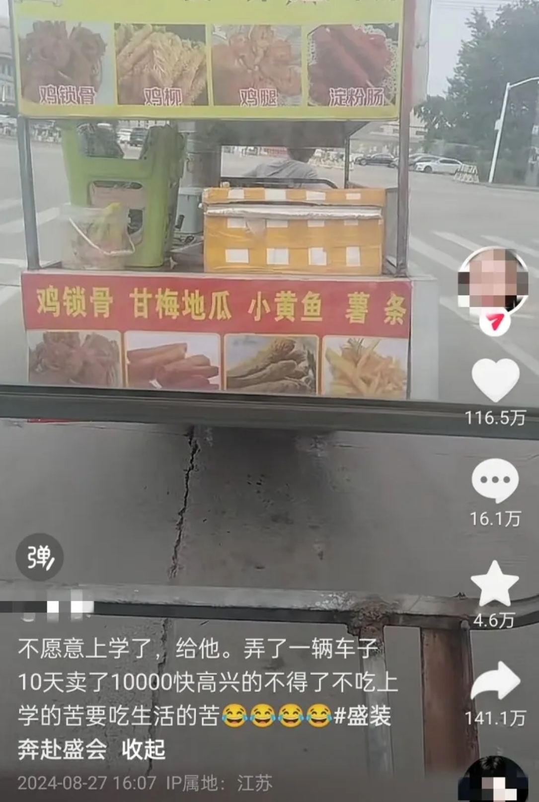 大皖新闻记者注意到,该话题走红网络源于8月27日一网民在社交平台上发布的一段视频,配文称“不愿意上学了,给他弄了一辆车子,10天卖了10000块,高兴得不得了,不吃上学的苦,要吃生活的苦”。视频中,一名男生驾驶着炸货餐车行驶在街头。视频发布后,很快引发了关注,点赞量突破百万,评论量也超过16万条,有人点赞支持,也有人认为多学习才是长久之计,网民们议论纷纷。