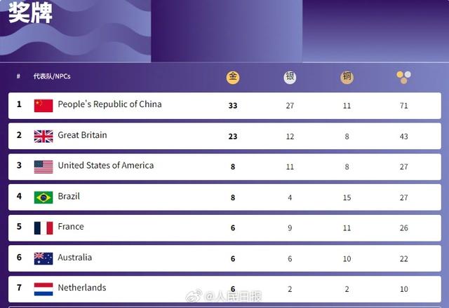 骄傲转发!中国队巴黎残奥金牌奖牌断层领先 人民日报 2024-09-02 9.8万 据巴黎残奥会官网显示,截至目前,中国代表团在巴黎残奥会上的奖牌数为33金27银11铜,共71枚奖牌,位居奖牌榜第一位。巴黎残奥会奖牌榜↓↓继续为你们加油! (人民日报) 责任编辑:彭茜