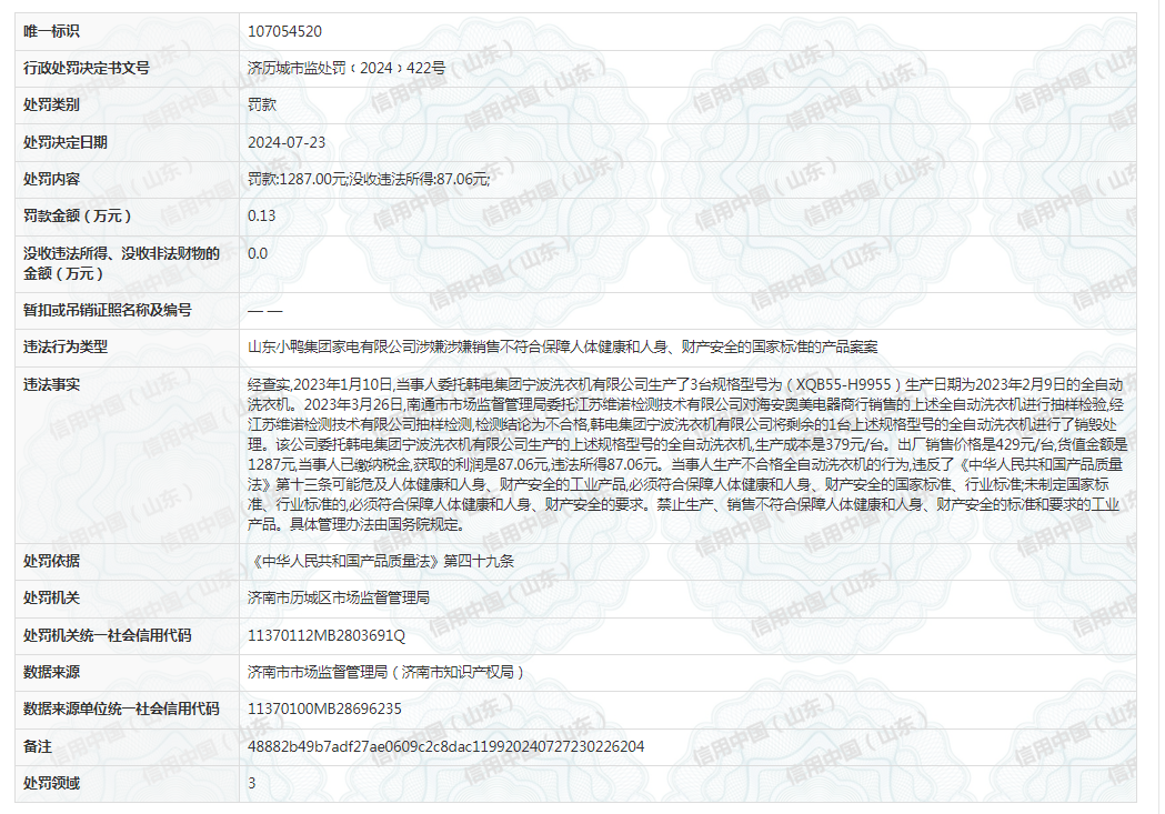 济历城市监处罚﹝2024﹞422号行政处罚决定书文号显示,经查实,2023年1月10日,当事人委托韩电集团宁波洗衣机有限公司生产了3台规格型号为(XQB55-H9955)生产日期为2023年2月9日的全自动洗衣机。2023年3月26日,南通市市场监督管理局委托江苏维诺检测技术有限公司对海安奥美电器商行销售的上述全自动洗衣机进行抽样检验,经江苏维诺检测技术有限公司抽样检测,检测结论为不合格,韩电集团宁波洗衣机有限公司将剩余的1台上述规格型号的全自动洗衣机进行了销毁处理。该公司委托韩电集团宁波洗衣机有限公司生产的上述规格型号的全自动洗衣机,生产成本是379元/台。出厂销售价格是429元/台,货值金额是1287元,当事人已缴纳税金,获取的利润是87.06元,违法所得87.06元。当事人生产不合格全自动洗衣机的行为,违反了《中华人民共和国产品质量法》第十三条可能危及人体健康和人身、财产安全的工业产品,必须符合保障人体健康和人身、财产安全的国家标准、行业标准;未制定国家标准、行业标准的,必须符合保障人体健康和人身、财产安全的要求。禁止生产、销售不符合保障人体健康和人身、财产安全的标准和要求的工业产品。具体管理办法由国务院规定。