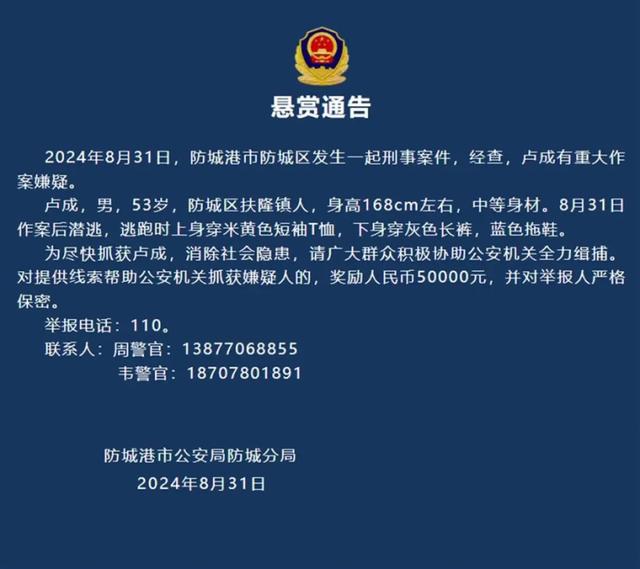 据防城港市公安局防城分局发布的悬赏通告,2024年8月31日,防城港市防城区发生一起刑事案件,经查,卢成有重大作案嫌疑。卢成,男,53岁,防城区扶隆镇人,身高168cm左右,中等身材。8月31日作案后潜逃,逃跑时上身穿米黄色短袖T恤,下身穿灰色长裤,蓝色拖鞋。请广大群众积极协助公安机关全力缉捕,对提供线索帮助公安机关抓获嫌疑人的,奖励人民币5万元。