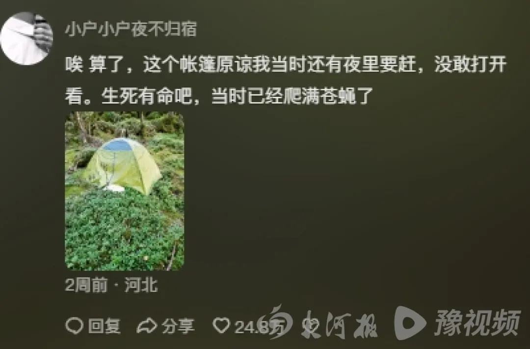 记者注意到,“猛蛇过江”的视频评论区中,网友“小户小户夜不归宿”回复称:“这个帐篷原谅我当时还有夜路要赶,没敢打开看,生死由命吧,当时已经爬满苍蝇了。”并配有一张上述帐篷照片,帐篷拉链还未被打开。