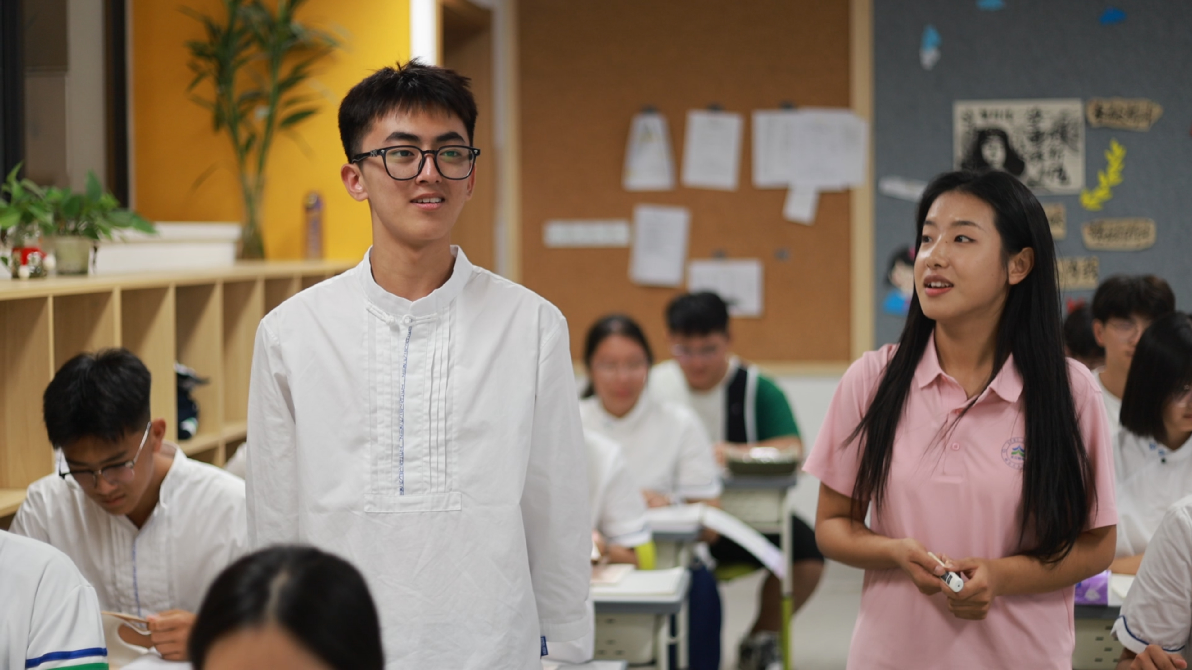 9月4日,烟台天立高级中学高二11班的历史课堂上,孙文静正在用问答方式跟同学们回顾当堂历史课上的重点内容。