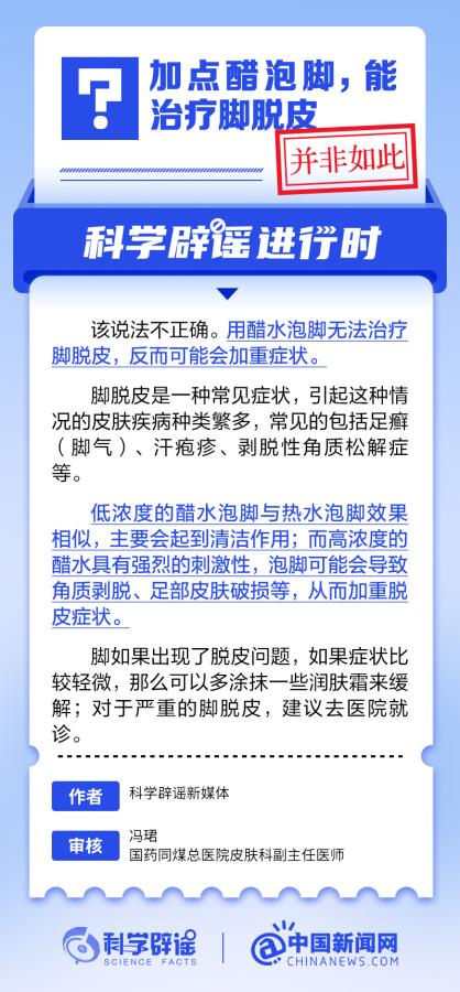 加点醋泡脚能治脚脱皮吗? 中国新闻网 2024-09-10 1113 中新网9月9日电 用醋水泡脚无法治疗脚脱皮,反而可能会加重症状。脚脱皮是一种常见症状,引起这种情况的皮肤疾病种类繁多,常见的包括足癣(脚气)、汗疱疹、剥脱性角质松解症等。低浓度的醋水泡脚与热水泡脚效果相似,主要会起到清洁作用;而高浓度的醋水具有强烈的刺激性,泡脚可能会导致角质剥脱、足部皮肤破损等,从而加重脱皮症状。(来源:@科学辟谣 中国新闻网微博) 责任编辑:孟猛