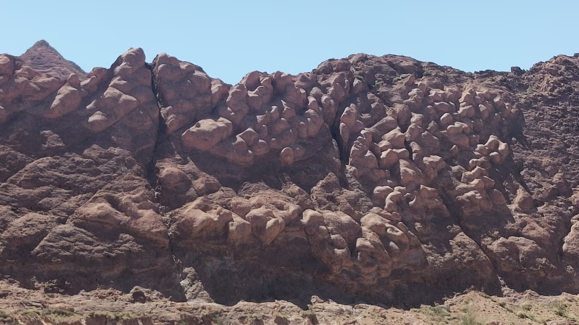 峡谷区域平均海拔1600米,最高山峰2048米。组成峡谷的奇峰群山由赭色的泥质沙岩构成,当地维吾尔语叫做“克孜利亚”,即红色的山崖。庞大的红色山体群形成于距今1.4亿年前的中生代的白垩纪,经亿万年的风剥雨蚀,洪流冲刷,形成纵横交错、层叠有序的垅脊与沟槽,远看如诗如画,有的状若“布达拉宫”,似仙天琼阁;有的近瞧若人似物,如梦似幻,惟妙惟肖。令人有鬼斧神工,奇景天成之慨叹。在阳光照射下,大有不是火焰山,胜似火焰山之奇感。