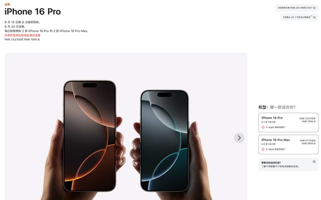 iPhone 16 Pro及iPhone 16 Pro Max两款机型搭载性能更强的A18 Pro芯片,分别配备6.3和6.9英寸的屏幕。iPhone 16 Pro国行版起售价为7999元,iPhone 16 Pro Max国行版起售价为9999元。