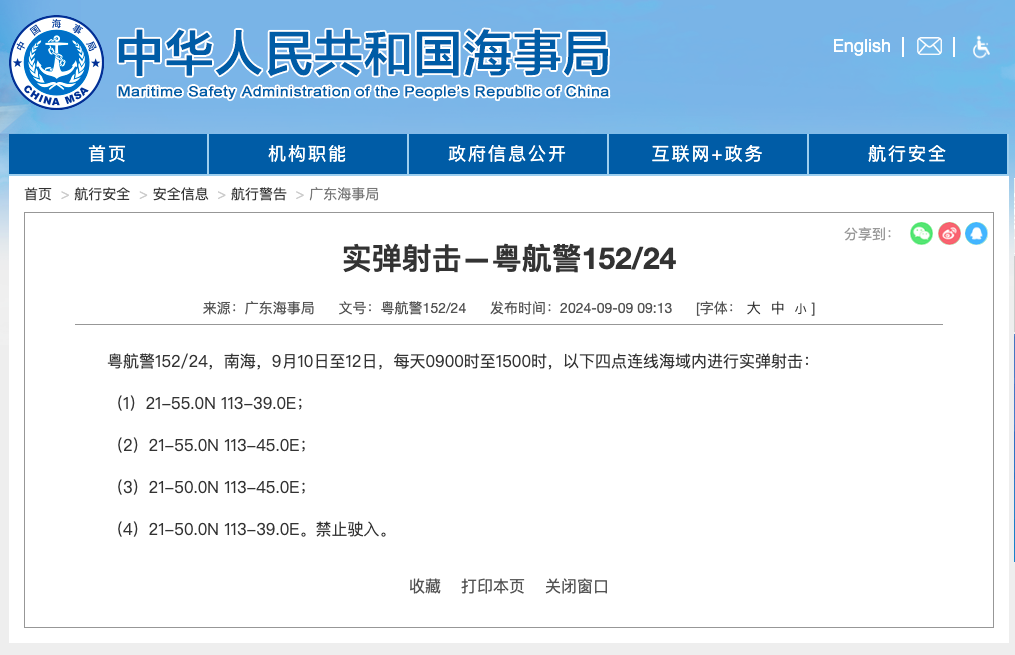 航行警告!南海实弹射击 中国海事局网站 2024-09-10 5997 据中国海事局网站消息,广东海事局发布航行警告,9月10日至12日,每天9时至15时,南海部分海域进行实弹射击,禁止驶入。 (中国海事局网站) 责任编辑:吴佳