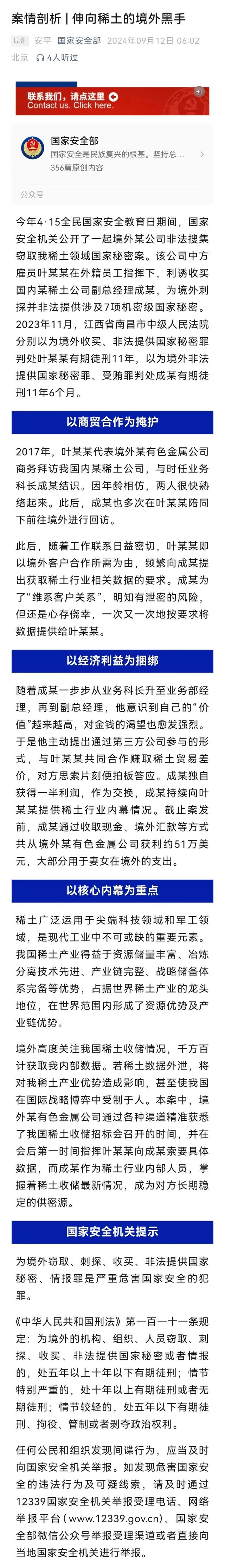 国家安全部12日发文《案情剖析 | 伸向稀土的境外黑手》: