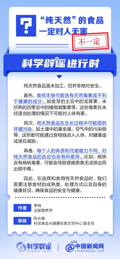 “纯天然”的食品一定对人无害? 中国新闻网 2024-09-15 1742 纯天然食品虽未加工,但并非绝对安全。 首先,食材本身可能含有天然毒素或不利于健康的成分。如发芽的土豆中的龙葵素、未炒熟的四季豆中的植物凝集素等。 其次,纯天然食品在生长过程中可能受到环境污染,如土壤中的重金属、空气中的污染物等,这些都可能通过食物链进入人体。 再者,每个人的体质和代谢能力不同,对纯天然食品的反应也会有所差异。比如,杨桃含有杨桃毒素,可能会导致肾病患者无法排出而出现中毒。 责任编辑:消费频道张妍