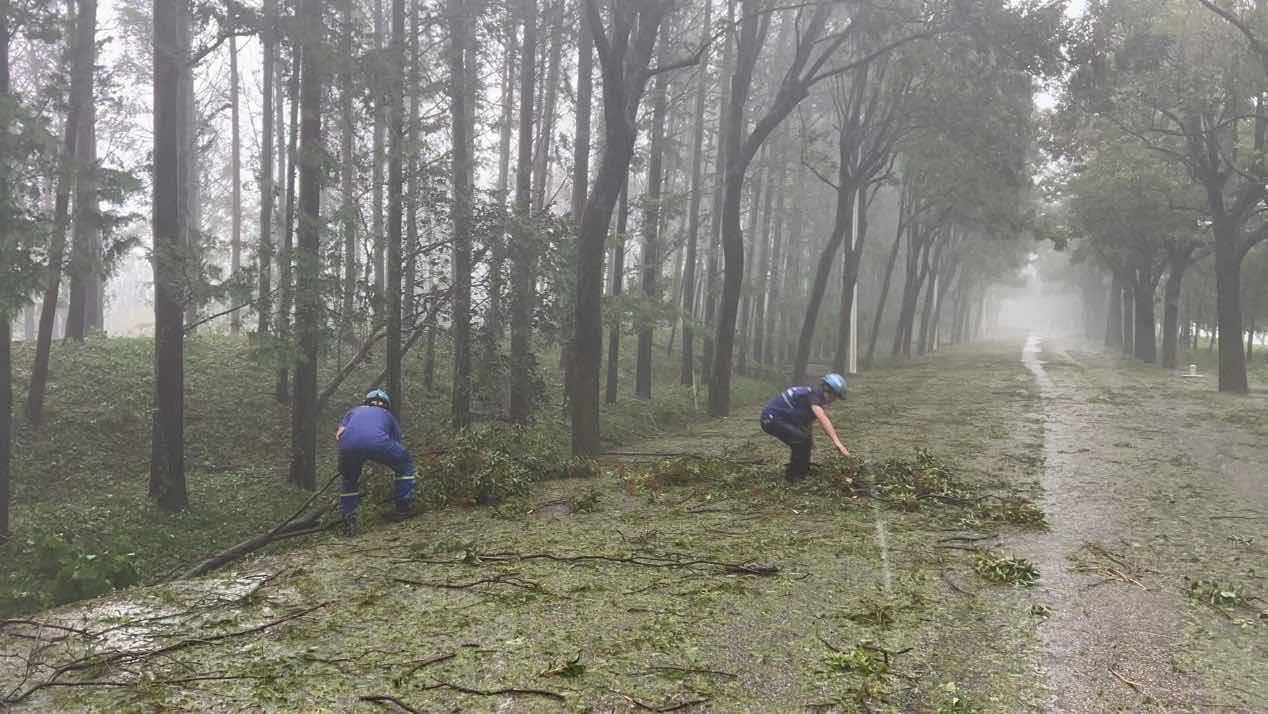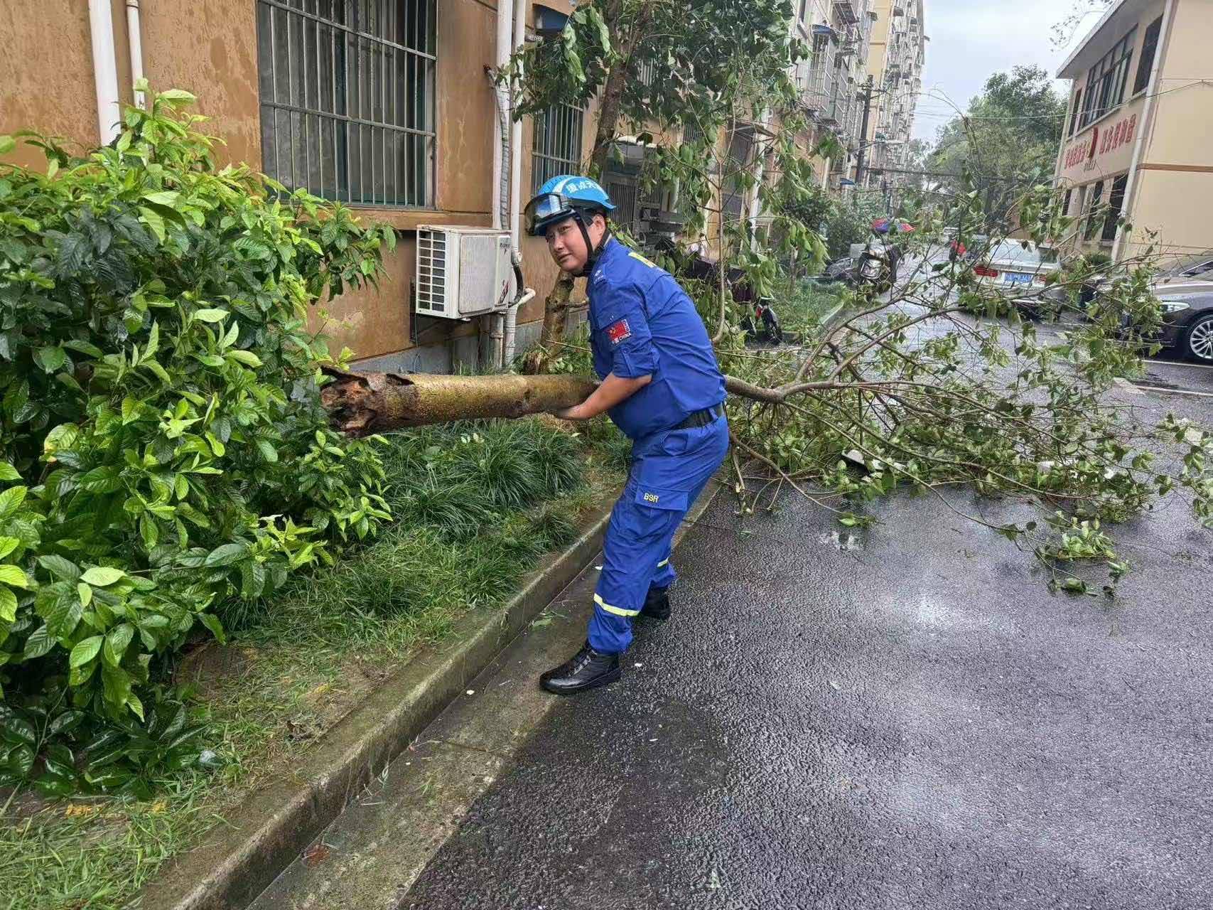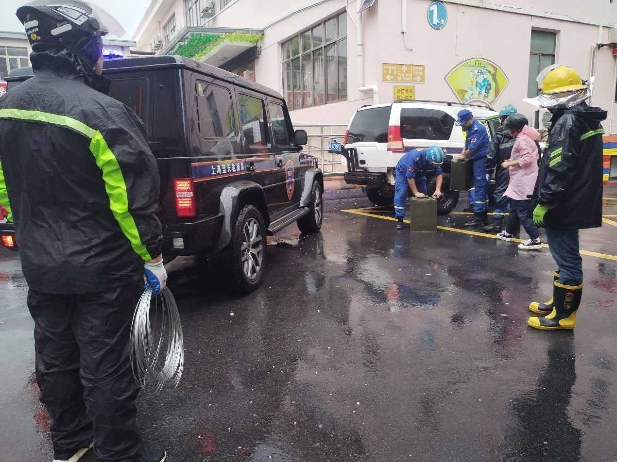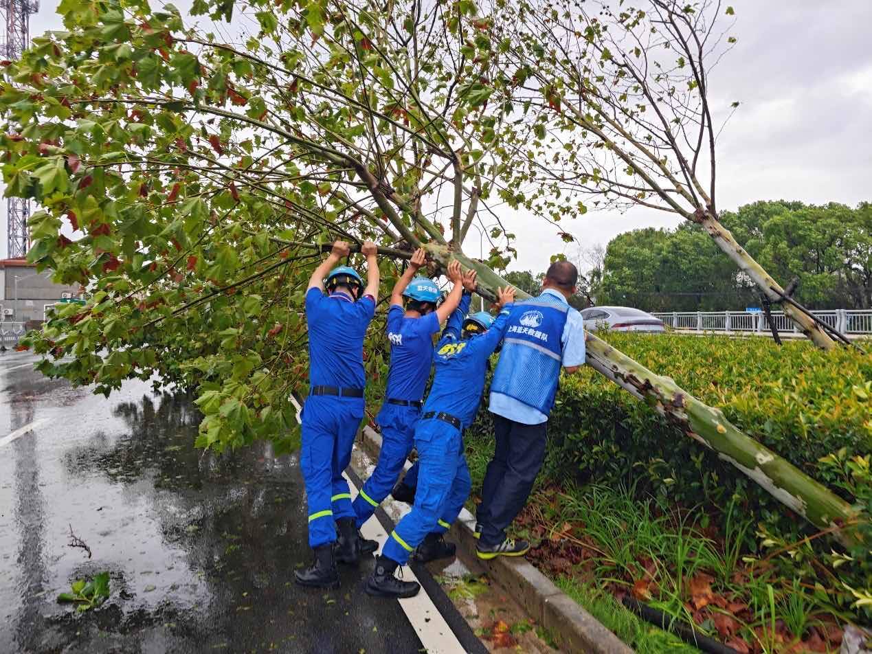 其中,第一小队前往浦东新区下盐路、康沈路进行路面清障,包括沿途路面路口,街面树枝清除,积水排水清除,车辆淹水拖挂救援;第二小队前往闵行华漕纪翟路居民社区、银杏新村进行小区高空挂物排险,树枝,雨棚排障排险。
