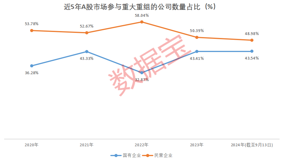 从参与主体来看,国有企业(含地方国企、央企)、民营企业是并购重组的主力军,其中参与并购重组的国有企业数量占比呈上升趋势,民营企业呈下降趋势,今年以来,国有企业公司共计64家,数量占比近44%,民营企业占比下降至49%左右。