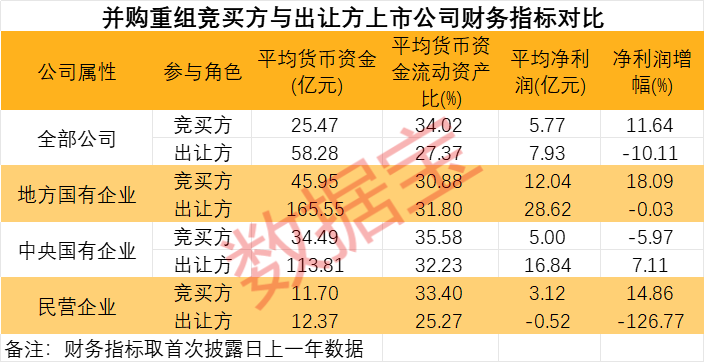 按公司属性划分,以国有企业来看,竞买方和出让方货币资金流动资产比相差不大,不过竞买方为地方国有企业上市公司的净利润增幅相对较高,达到18%,同期出让方净利润小幅下滑;中央国有企业中,竞买方上市公司净利润小幅下滑。从民营企业来看,竞买方、出让方上市公司T-1年平均货币资金流动资产比分别为33.4%、25.27%;同期竞买方净利润同比增长近15%,出让方净利润平均呈亏损状态。
