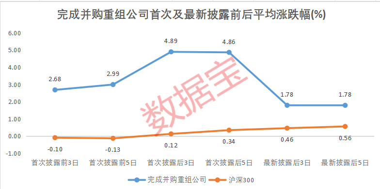 以2019年以来完成并购重组的公司来看,首次披露前3日至首次披露日,参与公司股价平均涨2.68%,同期沪深300指数下跌0.1%,前5日参与公司股价平均涨幅近3%,沪深300指数下跌0.13%;首次披露日至后3日、后5日,相关公司股价平均涨幅均接近5%,沪深300指数平均涨幅均低于0.5%。最新披露日至后3日、后5日,相关公司平均涨幅在2%以内,依然跑赢沪深300指数。