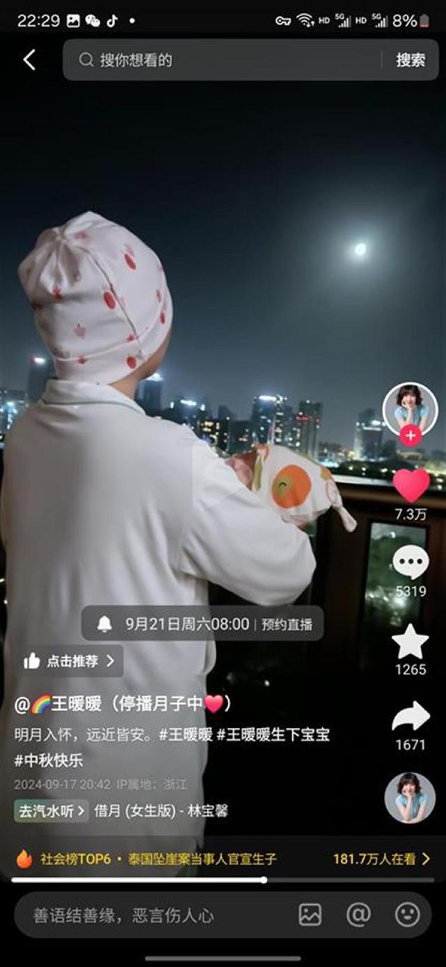 9月17日晚,王暖暖晒出了自己抱着宝宝站在阳台赏月的视频,十分温馨。