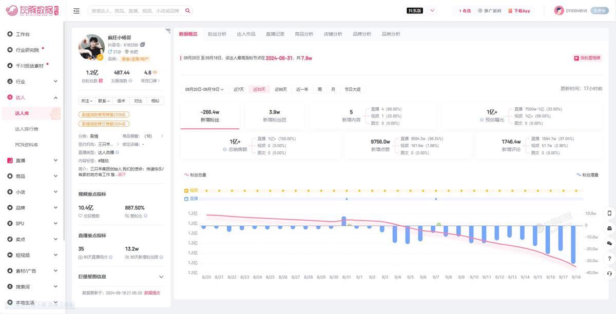 第三方数据平台“灰豚数据”显示,9月18日当天,截至记者发稿,“疯狂小杨哥”账号掉粉已超过32万。在近7天时间内,“疯狂小杨哥”账号掉粉129万,近30天时间内掉粉266万。目前,该账号粉丝数量为1.2亿。