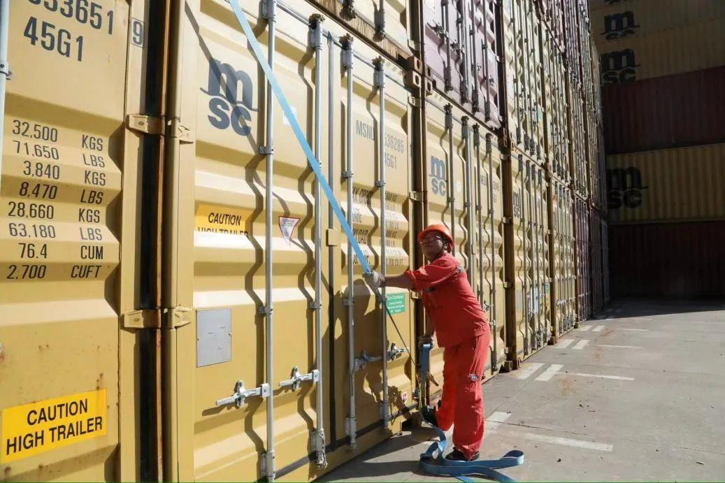 △ 上海洋山三期码头工作人员在堆场固定集装箱