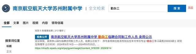 不过,南航苏州附中官网“勤杂工”检索结果提供的《南京航空航天大学苏州附属中学 勤杂工临聘合同制工作人员 录用公示》预览信息中,也披露了与网传截图一致的公示信息。此外,苏州工业园区教育网关于“勤杂工”的检索结果预览信息,也同样披露了相关公示信息。