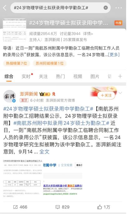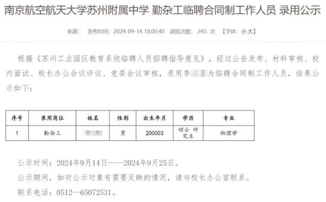 近日,一则“南航苏州附属中学勤杂工临聘合同制工作人员的录用公示”引发关注,该公示信息显示,一名24岁物理学研究生拟被聘为该中学勤杂工,相关话题冲上热搜。