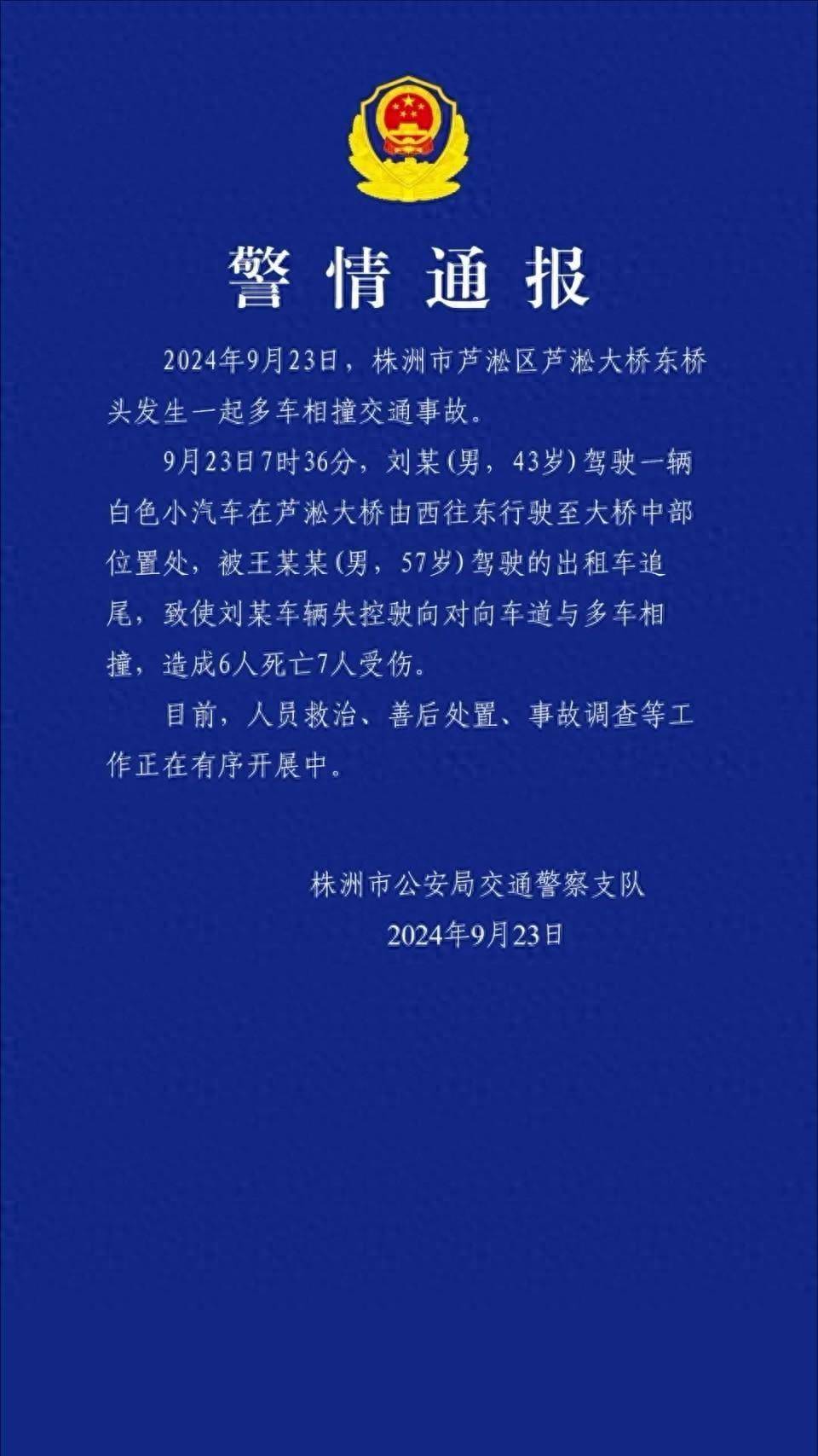 同日,株洲市公安局交通警察支队发布《警情通报》显示,9月23日7时36分,刘某(男,43岁)驾驶一辆白色小汽车在芦淞大桥由西往东行驶至大桥中部位置处,被王某某(男,57岁)驾驶的出租车追尾,致使刘某车辆失控驶向对向车道与多车相撞,造成6人死亡7人受伤。目前,人员救治、善后处置、事故调查等工作正在有序开展中。