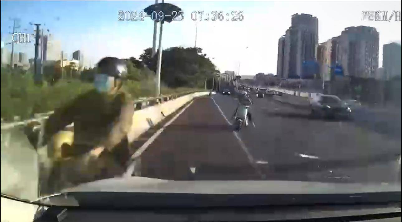 白车的行车记录仪显示,事发时间为9月23日上午7时36分16秒,白车在大桥行驶过程中,因前车亮起刹车灯,随即减速。后画面晃动,疑已被后车追尾。车辆随即驶向对向车道,并不断加速,疑似为躲避对向车辆,与多辆边道行驶的电动车、摩托车相撞,随后又转向右侧车道,与对向一小汽车相撞。