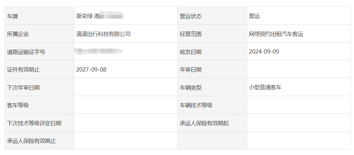 华商报大风新闻记者从湖南省道路运输服务平台获悉,涉事网约车系营运车辆,属于“滴滴出行科技有限公司”,证件核发日期为“2024年9月9日”。