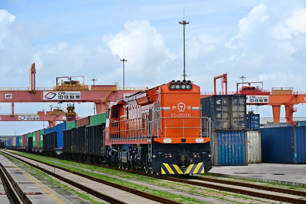 一列中欧班列从中国-上海合作组织地方经贸合作示范区(上合示范区)多式联运中心发车。新华社记者李紫恒 摄