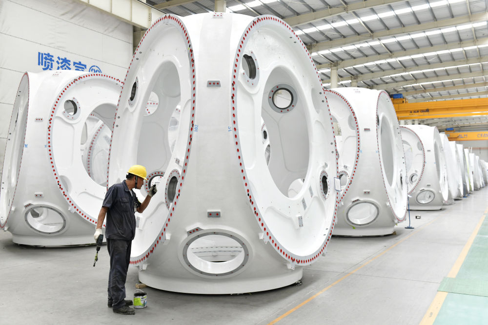 工人在山东省滨州市惠民县风电装备制造产业园涂装车间涂装风电轮毂。新华社记者郭绪雷 摄