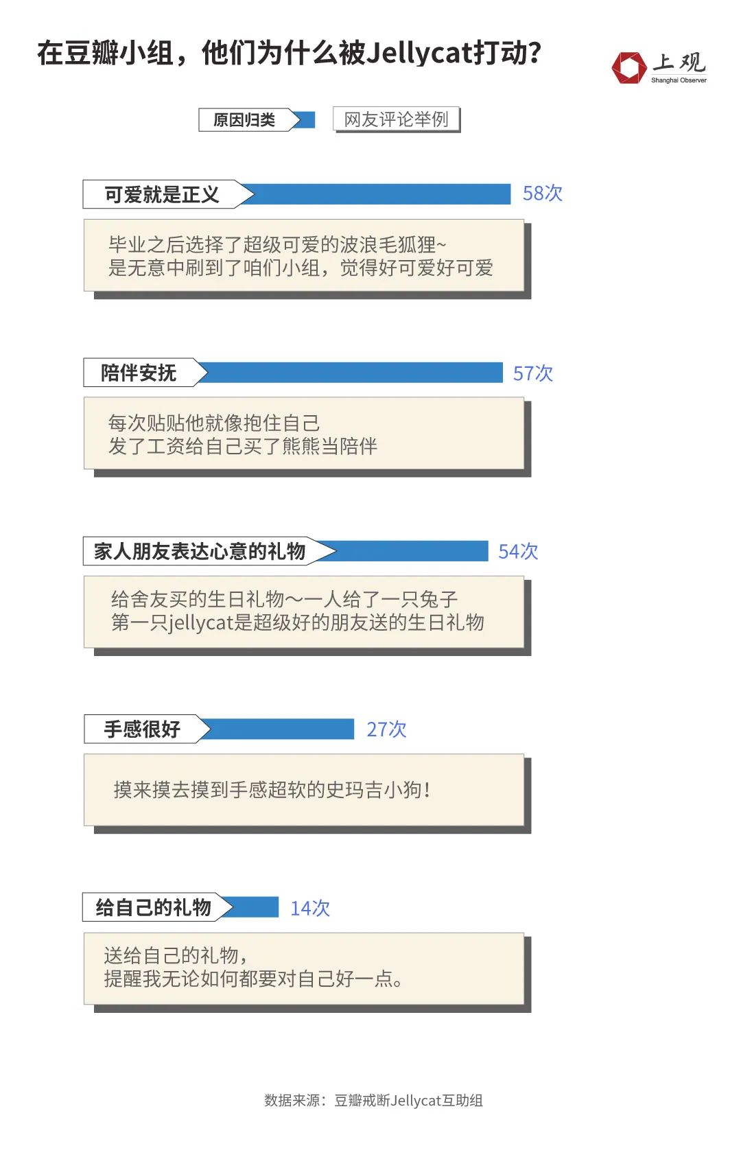 在豆瓣小组里“讲述你与Jellycat的第一次!”的话题下,有接近30%的网友表示自己第一次拥有Jellycat玩偶就是朋友、家人、伴侣赠送的礼物,或者是毕业、生日、考研结束等各种时间节点犒赏自己的礼物。