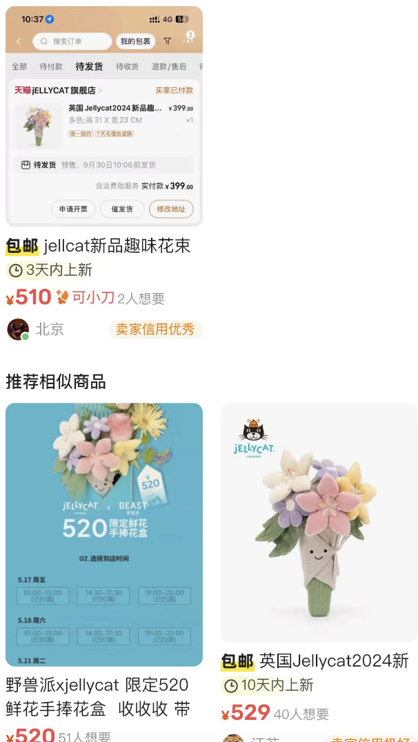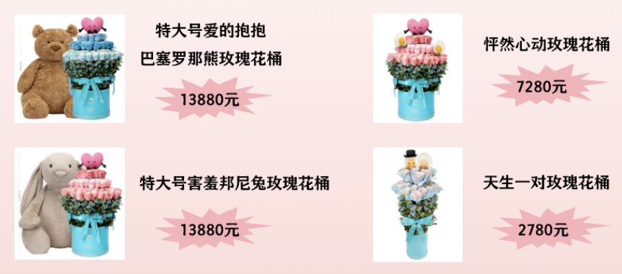 今年520,在“万物皆可为花”和“万物皆可JellyCat”的风潮下,线下限时花店需要排队预约,联名玫瑰花桶更是卖到了13880元。