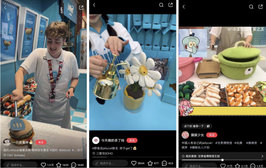 此前,纽约Jellycat“快餐”店,店员模拟服务生制作、打包汉堡、披萨过程,让消费者沉浸式体验,玩偶一售而空,相关视频就在国内爆火。