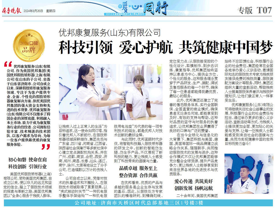 优邦康复服务(山东)有限公司,作为美国优邦集团(美国优邦假肢矫形器(上海)有限公司)在山东的子公司,坐落于山东省济南市。公司自成立以来,深耕假肢矫形康复服务领域,专注于为客户提供专业、全面、个性化的假肢矫形器康复解决方案。依托美国优邦集团的强大资金支持和先进的技术背景,优邦康复服务(山东)有限公司不仅继承了跨国企业的深厚底蕴,积极融入本土市场,致力于成为康复服务行业的佼佼者。公司拥有经验丰富、技术精湛的技术团队,以客户需求为导向,为每一位客户提供最优质的康复服务体验。