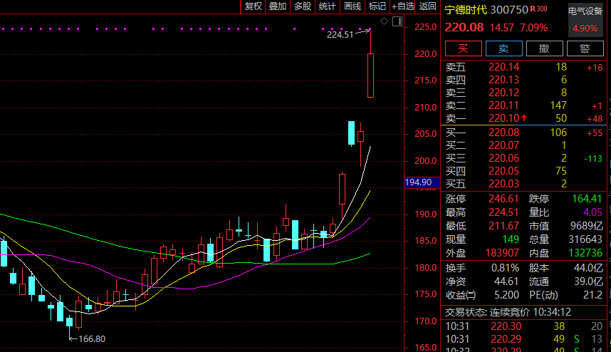 龙头股创业板“一哥”宁德时代盘中一度放量大涨逾9%,创1年来新高,1小时成交接近昨日(9月26日)全天成交,这也是今日(9月27日)创业板指大涨的重要原因之一。
